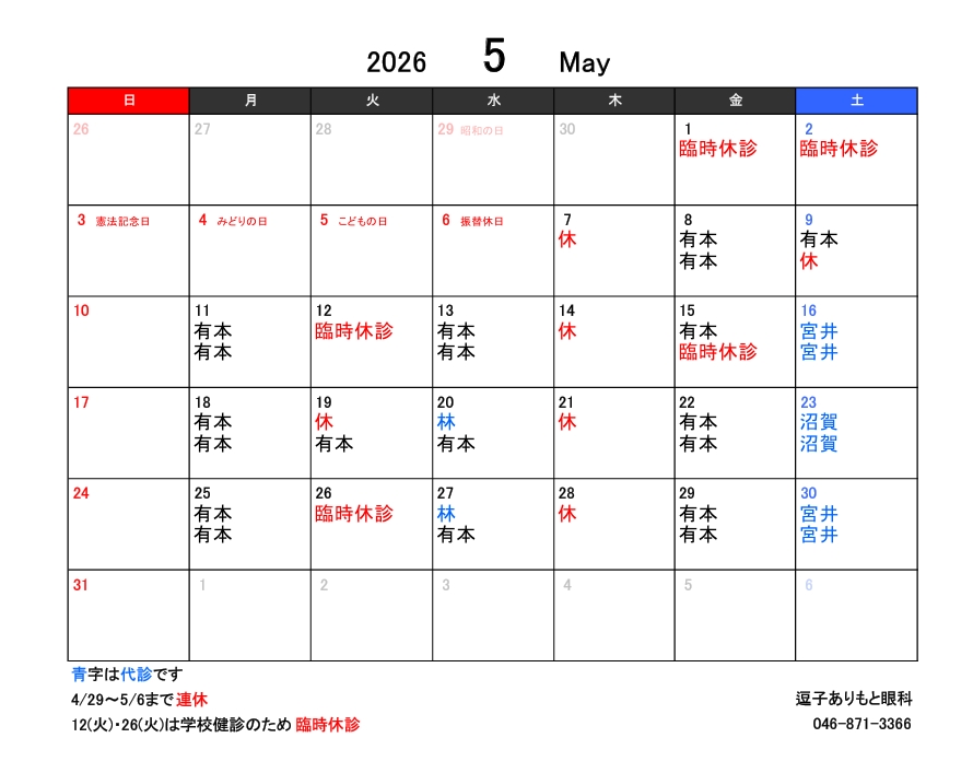 - 5月臨時休診のお知らせ